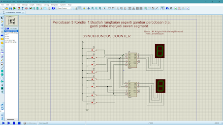 [KEMBALI KE MENU SEBELUMNYA] DAFTAR ISI 1. Kondisi 2. Gambar Rangkaian 3. Video 4. Prinsip Kerja Rangkaian 5. Link Download 1. Kondisi [Kembali] Kondisi →Percobaan 2 Kondisi 6 Buatlah rangkaian seperti gambar percobaan 2 dengan menggunakan IC 7448 dengan menggunakan Common Anoda 2. Gambar Rangkaian [Kembali] 3. Video [Kembali] 4. Prinsip Kerja Rangkaian [Kembali] Pada rangkaian percobaan 2 kondisi 6 ini, menggunakan 7 switch-spdt, Decoder IC 7448 dan seven segment anoda. Untul IC 7448, terdiri dari 14 kaki, dimana 4 inputan, yaitu A, B, C, D, kemudian terdiri dari 7 output yaitu QA, QB, QC, QD, QE, QF, QG, serta terdapat 3 jalur yaitu LT, RBI, dan RBO. Jalur LT (Lamp Test) pada IC berfunsi untuk menyalakan semua led pada penampil 7 segmen, jalur LT akan aktif pad saat diberikan logika LOW pad jalut LT tersebut. Kemudian ada j alur RBI (Riple Blanking Input) yang berfungsi untuk menahan sinyal in...